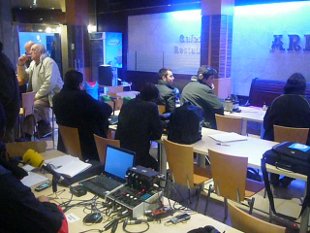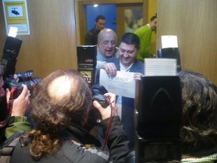 Os dirixentes populares continúan no interior da sede, analizando os datos recollidos ao longo da xornada; mentres, fóra, na sala de prensa, os xornalistas agardan. O éxito ou o fracaso popular pode depender dun escano.