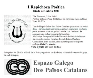 Espazo Galego dos Països Catalans promove un recital libre e participativo, onde se poida celebrar e pór en común obras en galego e en catalán, onde amizade e compañeirismo se mesturen coa literatura. Ao mesmo tempo, festéxase o Día Nacional da Galiza nas nosas linguas desde os Països Catalans.