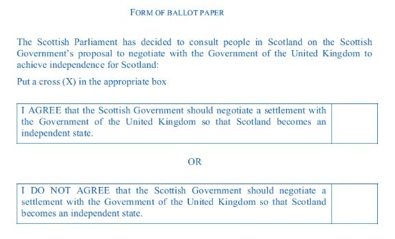 O documento recolle ademais a pregunta do hipotético referendo: os votantes deberan decidir se están de acordo ('I agree') ou desacordo ('I do not agree') con que "o goberno escocés negocie un acordo co goberno do Reino Unido para que Escocia se converta nun estado independente".