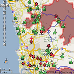 KPBS, a estación de tele de San Diego proporcionou mapas dos incendios actualizados instantaneamente, atopar información tanto sobre os propios incendios como sobre os refuxios, moi úteis para a poboación sinistrada ou que corría o risco de selo.