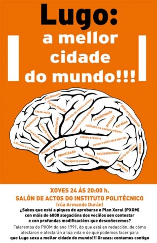 Varias asociacións e colectivos cívicos do municipio de Lugo organizan unha charla-coloquio, este xoves ás 20.00 horas no Instituto Politécnico, para falar sobre as consecuencias do vello PXOM, de 1991, e mais do que está a redacción, e para debater sobre as diversas propostas "que consigan facer de Lugo a mellor cidade do mundo".