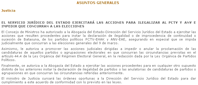 Concretamente o Consello de Ministros deu permiso para "exercitar as accións que resulten procedentes para instar a declaración de ilegalidade ou de improcedencia de continuidade ou sucesión de Batasuna, dos partidos políticos PCTV-EHAK e ANV-EAE, asegurando en especial que se impida xudicialmente que concorran ás eleccións xerais do 9 de marzo".