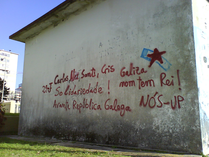 Esta terza feira ás 10:00 horas da mañá entraban a declarar na Audiencia Nacional, ante o xuíz Grande-Marlaska, os catro mozos do Condado-Paradanta (Alexandre Bolívar, Cristopher Machado, Santiago Mendes e Carlos Pena), acusados de queimar unha efixie a tamaño real do xefe do Estado Español, o pasado 6 de decembro na manifestación pola autodeterminación convocada por Causa Galiza en Vigo.