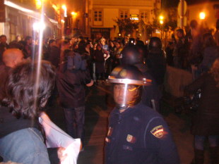 Tamén eran numerosos os efectivos dos antidisturbios, que aos cinco minutos de iniciarse a concentración pacífica diante da policía pedíronlles aos estudantes que deixasen libre a beirarrúa. Ante a negativa dos concentrados as forzas policiais iniciaron uns minutos de tensión, con empurróns e algún amago de carga. Finalmente, os estudantes disolvéronse en silencio e de xeito voluntario.