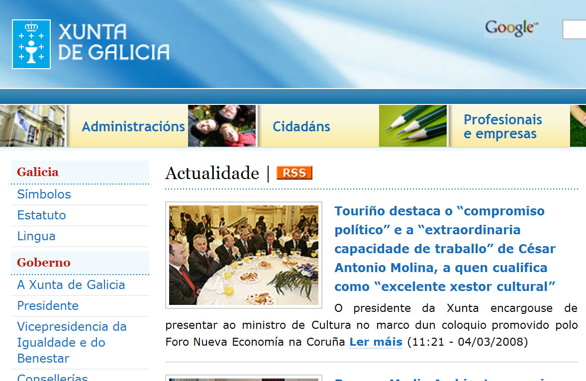 Exemplo tamén da confusión electoral e institucional en tempo de campaña é o acontecido este mesmo martes durante o coloquio do Foro Nueva Economía, na Coruña, onde o ministro de Cultura contou como anfitrión con Emilio Pérez Touriño, presidente da Xunta e secretario xeral do PSdeG. O acto e os discursos ofreceron mostra de liñas pouco claras á hora de diferenciar o candidato, do ministro e do intelectual. Por riba, e paradoxalmente, ás poucas horas Presidencia escolleu abrir a web oficial do Goberno coa información sobre este acto como noticia principal do portal web.