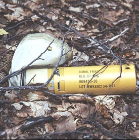 As bombas en acio son armas de saturación aérea formadas por unha bomba contedor que se abre no aire (ou onde estea) dispersando centos de submunicións (metralla) que non distinguen entre os obxectivos, isto é, alcanzando o 98 por cento das veces a civís. Mais isto non é o peor desta arma. O peor é que unha parte das submunicións non explotan, senón que fican esparexidas polo chan, sen control, prolongando indefinidamente o terror da guerra e actuando como as minas antipersonais, mutilando ás persoas moitos anos despois de que se dese por terminado o conflito no que foron deitadas.
