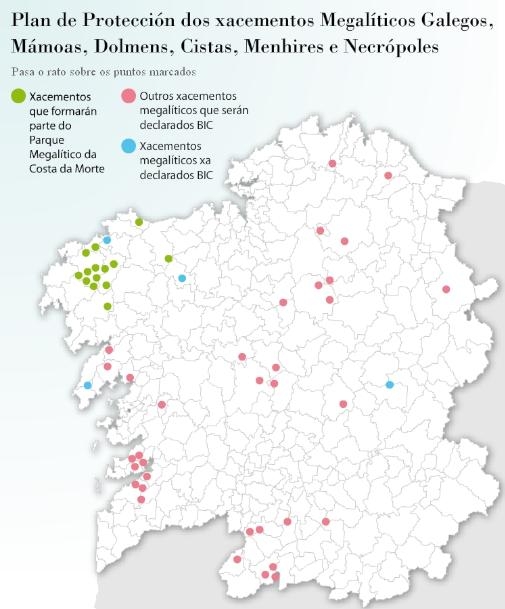 Co fin de protexer e pór en valor os principais restos megalíticos do noso país, a Consellaría de Cultura iniciou o proceso de estudo e delimitación de 48 depósitos para podelos declarar como Ben de Interese Cultural (BIC).