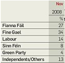 A enquisa coloca Fine Gael por diante de Fianna Fáil por primeira vez na historia das enquisas do Irish Times. Labour Party perde un punto e colócase co 14 % do apoio cidadán, ainda que o seu líder Eamonn Gilmore é o mais popular dos líderes políticos. Os Verdes perden un punto e caen ao 4% mentres que Sinn Féin conserva o 8 % do apoio do publico.