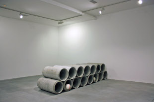 As obras dispóñense estratexicamente na sala, formando un itinerario harmónico, un ordenado curso que invita ao espectador a realizar un exercicio mental de conexións e illamentos "a frote", mantidos na superficie do real e do ilusorio mediante recursos formais e técnicos, que o artista exhibe poéticamente en cada solución, en cada material. Deste xeito, ademais da fibra de vidro e o aluminio, o formigón volta a ser elemento protagonista empregado como módulo e como estrutura de equilibrio: substituíndo as rodas dun Seat 600 de xeso por bloques de formigón; tamén como rotundidade física de ausencias ou ancoraxes da memoria: a peza formada por rulos de cemento que dialogan con dous balóns de xogo.