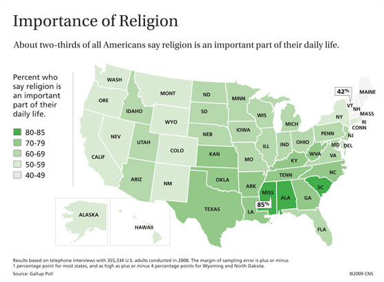 A sondaxe deixa datos curiosos. O primeiro é que aínda que varios estados dos EUA están entre os máis condicionados pola relixión, a Unión sitúase na media mundial debido ao contrapeso que efectuan os territorios do nordeste: Vermont (42%, ao igual que Suíza); New Hampshire (46%, similar a Corea do Sur); ou Massachusetts (48%, un pouco superior a Montenegro).