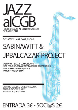 A actuación deste mes, dentro do I Ciclo de Jazz do CGB, vai a cargo do cuarteto SabinaWitt & JpBalcazar Project, que mostrará o seu traballo de jazz fusión coa música mediterránea e ritmos suramericanos.