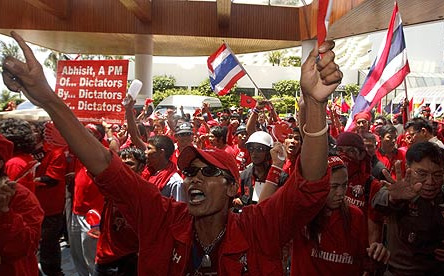 Un dos líderes dos grupos de protesta, Jatuporn Promphan, pediulle aos seus seguidores en todo o país, que se mobilizasen polas rúas, e marchasen cara a capital. Nunha mensaxe emitida nunha radio afín ao ex mandatario Thaksin Shinawatra, Promphan asegurou que o estado de dereito non rexe en Tailandia arestora, e que os camisolas vermellas, como son coñecidos os opositores pola cor das prendas que visten, teñen que botar abaixo o goberno de Vejajjiva.