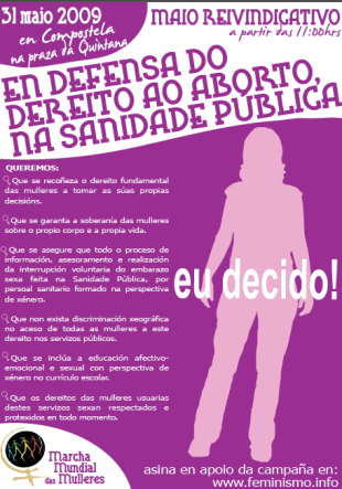 Este domingo a Praza da Quintana, en Santiago de Compostela, acolle desde as 11 horas o acto co que conclúe a primeira fase da campaña organizada pola Marcha Mundial das Mulleres baixo o lema "En defensa do dereito ao aborto, na Sanidade Pública!". Un Maio Reivindicativo que estará acompañado de flores, música e poesía.