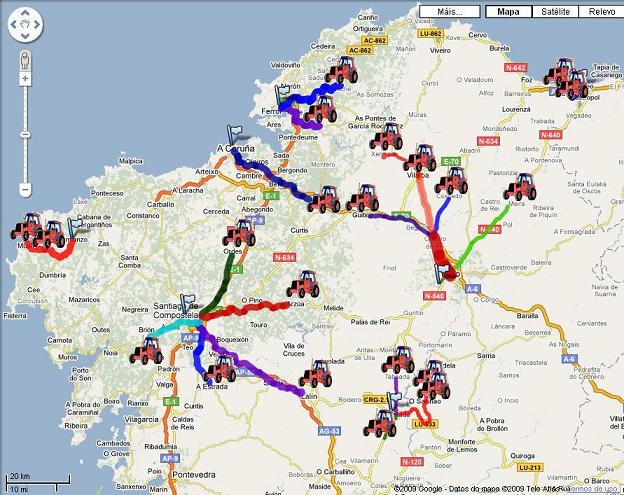 Velaquí o percorrido das distintas tractoradas (puntos de saída e concentracións) / Imaxe: SLG (clique para ampliar)