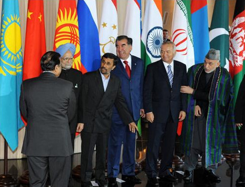 Ahmadinejad na cimeira do Consello de Cooperación de Shangai, en Rusia, antes de se reunir con Dmitri Medvédev