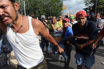 Após lanzar bombas de gas lacrimóxeno, o exército abriu fogo contra os milleiros de manifestantes que agardaban a chegada de Zelaya, dende primeira hora da mañá, na contorna do Aeroporto Internacional de Tocontín, en Tegucigalpa. Segundo a versión oficial, os soldados recorreron ás armas "como resposta aos intentos da multitude por tomar a pista de aterraxe do aeródromo". Porén, un xornalista da cadea Telesur informaba, en conversa telefónica, que presenciara a morte dun mozo que se atopaba agardando para recibir o presidente deposto, e que fora abatido polos disparos dos soldados. As imaxes emitidas pola cadea amosaban unha multitude cualificando de "asasinos" os soldados, varias persoas feridas e múltiples ambulancias acudindo ao lugar para atender e trasladar os afectados polo ataque do exército. Pouco despois das 16h00 (media noite en Galiza), fontes médicas confirmaban que as balas disparadas polos militares causaran a morte de, polo menos, unha persoa, Isis Obed Murillo Mencia, de 19 anos, e decenas de feridos. Porén, momentos despois, Tiempo sinalaba que os mortos eran dous, para volver rectificar, e denunciar un falecemento.