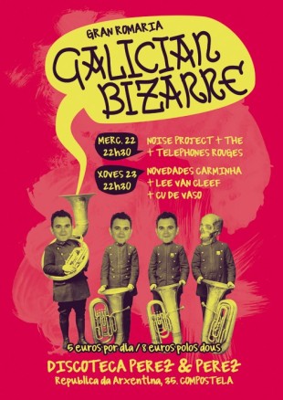 Di o refrán que 'Enterro sen choros e romaría sen gaitas, non ten graza'. Pois iso haberá que velo: A 'Gran Romaría Galicia Bizarre' promete de todo: punk, post-rock, ou simple bizarrismo guitarreiro, pero as gaitas nin están nin se agarda por elas. Os concertos serán no Pérez&Pérez de Compostela (República Arxentina, 35); o mércores estarán Noise Project (Valga), Telephones Rouges (O Grove) e The (Esteiro-Muros) e o xoves Cu de Vaso (Compostela), Novedades Carminha (Compostela) e Lee Van Cleef (Ferrol).