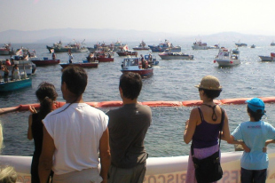 Convócao a Confraría de Pescadores de Cangas e secúndao en terra o Foro Social. Rosa Quintana, conselleira de Pesca, pide "que se rebaixe a tensión".