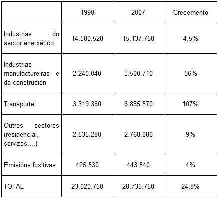 As emisións de CO2 procedentes de combustíbeis fósiles aumentaron en todos os sectores e, no transporte, duplicáronse, "o que evidencia a forte insustentabilidade do noso modelo territorial e de transporte". Ademais, tamén apuntan a presenza de dous grandes centrais térmicas de carbón, a de Endesa nas Pontes e a de Gas Natural-Unión-Fenosa en Meirama como causantes do aumento.
