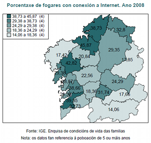 Os datos da Enquisa de condicións de vida das familias correspondente ao ano 2008 amosan que o uso das novas tecnoloxías por parte da cidadanía aumentou nos últimos anos. Porén, o traballo elaborado polo Instituto Galego de Estatística segue a amosar grandes desigualdades por idades e lugares de residencia, que se ven claramente representadas sobre o mapa.