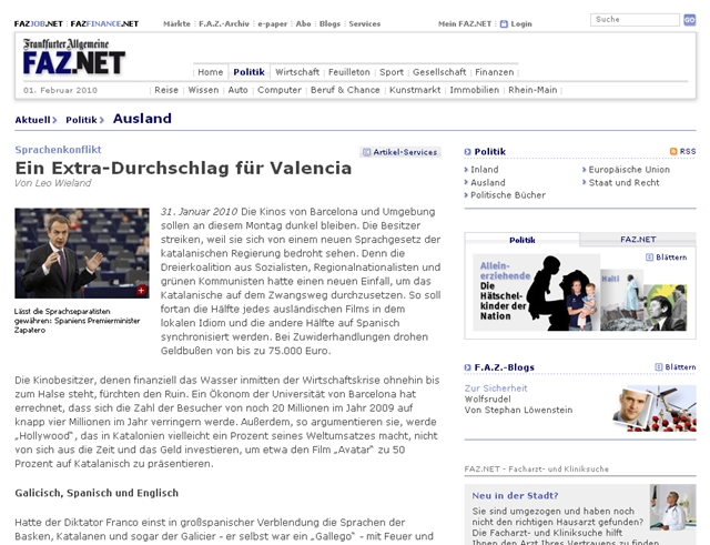 O 'Frankfurter Allgemeine Zeitung' analiza o 'problema lingüístico' no Estado Español, creado a raíz da "chegada dos nacionalistas aos gobernos rexionais".