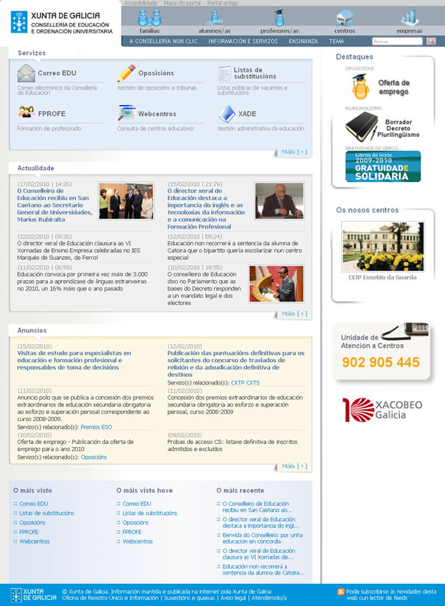 Así por exemplo, se queremos acceder ao apartado alumnos/as temos que teclear http://www.edu.xunta.es/web/students; ao de profesores/as, http://www.edu.xunta.es/web/teachers; ou ao de centros, http://www.edu.xunta.es/web/schools.