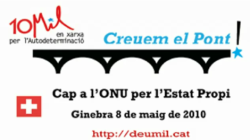 Co mesmo espírito Deumil.cat achégase este xoves a Xenebra para realizar un xesto diante da sede das Nacións Unidas e no que se fará entrega simbólica do conxunto dos votos da consulta soberanista do pasado mes de febreiro en ducias de municipios de Cataluña. Co mesmo obxectivo de internacionalizar a reclamación darase a coñecer un manifesto en prol do dereito de autodeterminación.