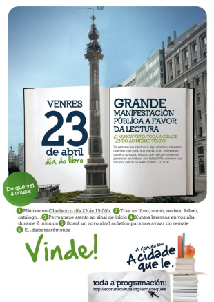 "Todos a unha", animan desde o Concello da Coruña, convidando a cidadanía a acudir á quedada no Obelisco este venres 23 de abril, aproveitando a celebración do Día do Libro, para ler en voz alta durante dous minutos. A cita é ás 19h.