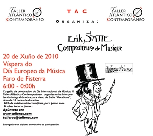 Case 120 anos despois de que a idease Erik Satie, esta peza será agora interpretada no Faro de Fisterra. Esta é a iniciativa que propoñen dende o Taller Atlántico Contemporáneo (TAC) para celebrar o Día Europeo da Música, o mesmo colectivo que se encargou doutra orixinal actuación musical en Compostela: a “Acción fuxidía para 111 ciclistas” de M. Kagel interpretada a golpe de pedal. Segundo nos explica o músico Luís Soto, un dos promotores da iniciativa, o obxectivo é xuntar a 35 pianistas que interpreten a peza de Satie en diferentes quendas dende as seis da mañá até as 12 da noite do próximo domingo.