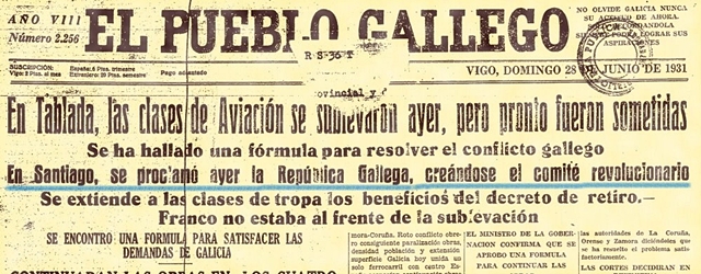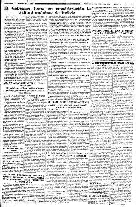 "Según dicen de Zamora, en Puebla de Sanabria se celebró una manifestación que recorrió las calles dirigiéndose al Ayuntamiento, donde izaron la bandera gallega. Se leía un cartel que tenía la siguiente inscripción: "Queremos anexarnos a Galicia." Además, acordaron declarar la huelga y no acudir a las elecciones". ('La Voz de Galicia', 28 de xuño)