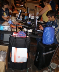 O feixe de tarecos tecnotrónicos que os seareiros da tecnoloxía achegaron até o Pazo de Congresos fai montaña ás portas da entrada. Velaí os carricoches que argallaron os organizadores para levar as toneladas de computador do coche á mesa.