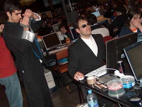 Avanzada a mañá do venres, hai quen remexe aínda nos miolos do computador. A maioría xa espremen a toda máquina a banda larga. Arredor de dous milleiros de computadores interconectados e millóns de arquivos compartidos. Entre xogos e música... lecer tecnolóxico para todos os gustos antes de que a fame aprete.