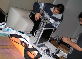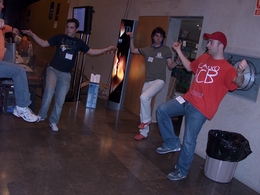 "En galego, por que non!". Xa foi lema da anterior edición de XuventudeGalizaNet e está subliñado outra vez en 2007. Aquí vemos aos máis rápidos en montar os equipos de volta e preparados xa para a conferencia de apertura da ciberfesta.