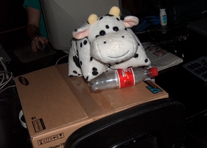 Vaca, pingüín e especie sen identificar, gardando a cancela deste decorado monitor. Exemplo das moitas mascotas na ciberfesta.