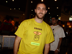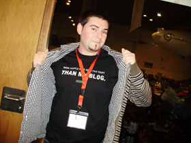 O ferrolán Amador Loureiro, ben coñecido na rede do país como dorfun, pasou pola ciberfesta a avaliar a promesa de banda larga. Velaí o teñen, con camiseta de referencia blogueira. Poden seguir as súas reflexións na Dorfunteca