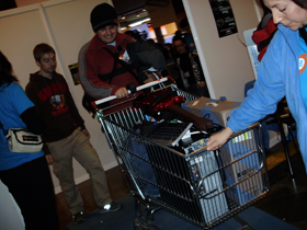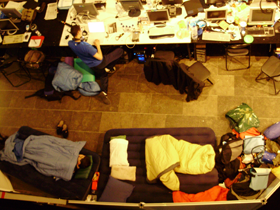 Algúns ciber-romeiros improvisan máis ca outros para pasar a noite. Nesta primeira houbo un golpe de xente que atreveu a desafiar o sono. Con todo, os máis sibaritas do soño non se conforman cun envurullo urxente en calquera recanto. Velaí algún dos camastros mellor arranxados que vimos esta noite. Parafraseando un menos coñecido filme que deu en famoso filme de culto entre a tecno-fauna: con que soñan os androides do país?