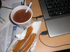 Logo de preguntas transcendentes e con obxectivos ben merecentes, pasamos a cuestións máis viscerais e perentorias pasando de certas horas da madrugada. Antes de marcharmos do recinto tecnotrónico, brindamos a pé de computador cun agasallo de chocolate.